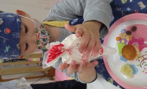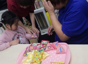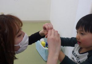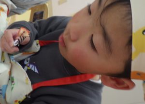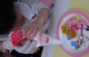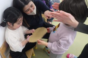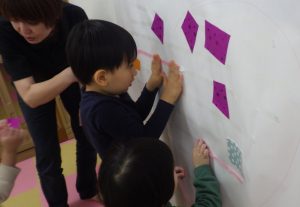 なかなか、でんぷんのりを使う機会はないかなと思い今回はあえてでんぷんのりを出してみました。「うわ・・・」と驚いている子どももいましたが、塗ってみると楽しかったようで「ベタベタまだやる!!」と教えてくれることがありました。