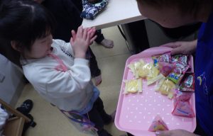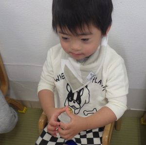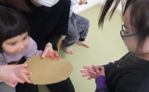 子どもたちは「ビリビリ~」「ビリビリ~」と言いながら、紙をちぎり、笑顔が出ていました。