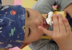 水やりをしたり、草取りをしながら秋になり収獲、脱穀をしました!!収獲では稲をハサミでチョキンと切ってくれました!!「硬いね」「チョキチョキ」と言いながら切ってくれました。脱穀では、すり鉢でガリガリ、クルクルと言いながら混ぜ混ぜしてくれました。そして、精米です。精米は機械に入れてクルクルと白米にしてくれました💓出来上がった白米でおにぎりを作りました。みんな思い思いのふりかけや具を入れておにぎり作りを楽しんでくれていたようです🌟