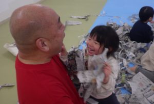 たくさん踊って歌った後は、新聞紙遊びをしました。あゆみでも時々活動で行いますが、今回は普段の何倍も多い量の新聞紙に子どもたちも職員も大興奮でした!