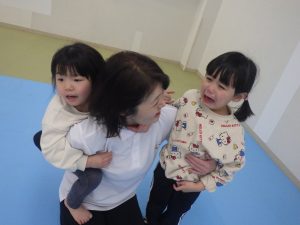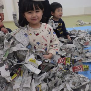子どもたちは「ビリビリ~」「ビリビリ~」と言いながら、紙をちぎり、笑顔が出ていました。