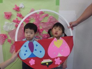 ・『愛を渡そう』では、ハート型をお友達に「どうぞ」と渡し、「ありがとう」と受け取る活動を行いました。やりとりをする練習を行いましたやお友達を意識することへつなげていきました。