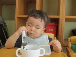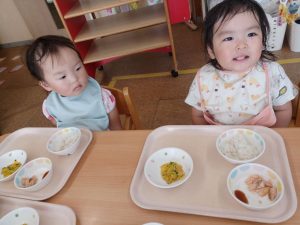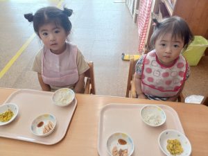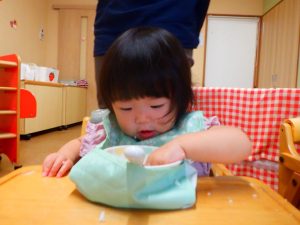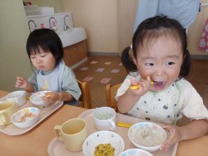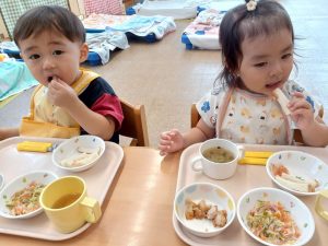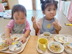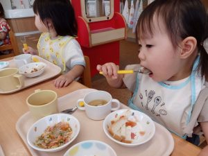 これからも,子どもたちが楽しみながら食事を行えるよう,「おいしいね」「もぐもぐ」とコミュニケーションをとりながら食具の使い方の練習を進めていきたいと思います。
