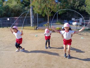 毎年この時期に,各年齢に合わせて大繩や縄跳びを取り入れており,ぶどう組になると上手に跳べるように
