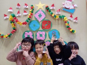22日は子どもたちが楽しみしていたクリスマス会がありました。今年のぶどう組の出し物は,手袋をつけて様々な動きを表現するフィンガーアクションに挑戦しました。「ジングルベル」の曲に合わせて,動いたり移動したりすることに最初は難しさを感じていましたが,少しずつタイミングが合うと,「できたね!」と嬉しそうに喜び合う姿がありました。「最後はこんなポーズにしたい。」「もっと手を広げたらツリーの形に見えるよね。」など,自分たちでどのように表現するか意見を出し合いながら,練習を頑張っていました。