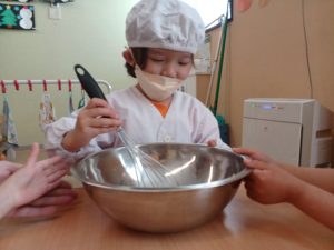 りんご組になり,初めてのクッキング。朝から「〇〇のエプロン持ってきたよ。」と今か今かと楽しみな様子の子どもたち。今回は『りんごのケーキ』を作りました。最初に栄養士からりんごの栄養について話を聞いた後,作る手順やどんな材料を使用するのか等,1つずつ絵カードで確かめた後,調理に入りました。材料を入れる際は,こぼれないようにボウルをしっかりと抑えたり,材料を混ぜる際は「1,2,3…。」と数を数えたり,グループのみんなで協力しながら作り進めることができました。また,混ぜていくと「いいにおいがする。」「〇〇色になってきたね。」と様々な変化に気付いていました。その後,材料の入ったカップを給食室に持っていき元気な声で「よろしくお願いします。」と伝え,焼きあがるのを楽しみにしていました。