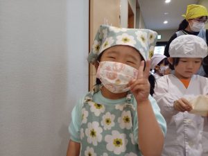 さあ,いよいよ待ちに待ったおやつの時間です。自分のケーキを受け取り,食べると「おいしい。」と嬉しそうに食べ進めあっという間に完食していました。自分で作ったおやつなので,一段と美味しかったと思います。笑顔がいっぱいのおやつの時間となりました。