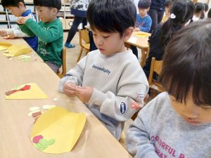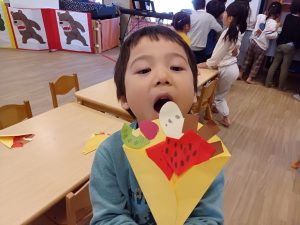 「いらっしゃいませ」のかけ声を合図に,いよいよお店がオープン。商品を紹介したり会計をしたり,それぞれが任された役割を一生懸命に取り組んでいました。また,年下の子にやり方を説明したりお手本を示したり,年長児として成長した姿もたくさんみられました。