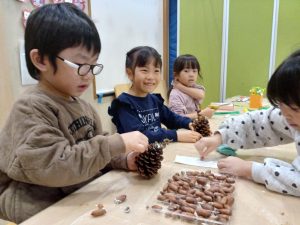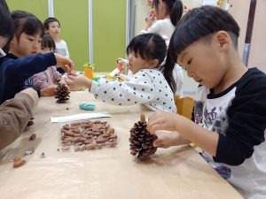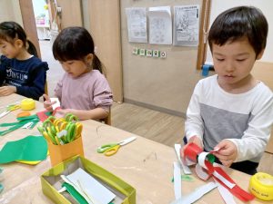 製作では,「キラキラにしたい」「ここに貼ろう」とハサミで形を切ったり,好きな色の飾りを選んだりと自分なりに工夫をしながら楽しんでいます。子どもたちのワクワクした気持ちとともに,楽しいクリスマスを迎えられますように!