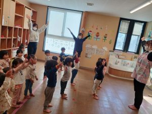 水曜日に行っている体操の日。石谷の森こども園オリジナルのたけのこ体操で体をほぐしてから,