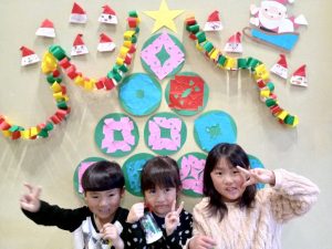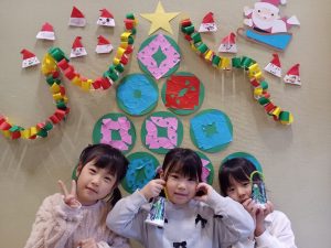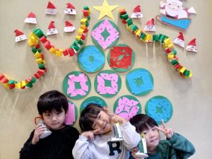 本番では,飾り付けをした室内をみて,ワクワクした様子の子どもたち。少し緊張している子もいましたが,皆で協力して取り組むことができ,元気な歌声と動きで素敵な発表となりました。また,サンタクロースも遊びに来て「どこに住んでいますか。」「夏は何をして過ごしていますか。」など,質問をしてふれあいを楽しみました。サンタクロースに驚いて涙をみせる乳児もいましたが,最後はツリーやサンタクロース,お友だちと一緒に記念撮影をして嬉しそうな子どもたちでした。今年のクリスマスはお話を聞いたり,職員による合奏や連弾,手拍子をしてたくさんうたを歌ったり,職員も子どもたちも笑顔あふれる素敵なクリスマス会でした。