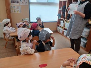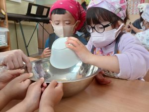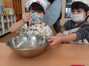 りんご組になり,初めてのクッキング。朝から「〇〇のエプロン持ってきたよ。」と今か今かと楽しみな様子の子どもたち。今回は『りんごのケーキ』を作りました。最初に栄養士からりんごの栄養について話を聞いた後,作る手順やどんな材料を使用するのか等,1つずつ絵カードで確かめた後,調理に入りました。材料を入れる際は,こぼれないようにボウルをしっかりと抑えたり,材料を混ぜる際は「1,2,3…。」と数を数えたり,グループのみんなで協力しながら作り進めることができました。また,混ぜていくと「いいにおいがする。」「〇〇色になってきたね。」と様々な変化に気付いていました。その後,材料の入ったカップを給食室に持っていき元気な声で「よろしくお願いします。」と伝え,焼きあがるのを楽しみにしていました。