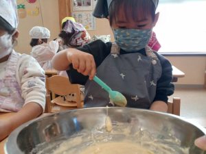 作る手順や調理するときの約束事を聞いて、さあ!クッキングスタート。さつまいもをつぶしたり調味料 を混ぜたりみんなで協力しながら作ることができました。