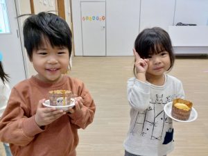 さあ,いよいよ待ちに待ったおやつの時間です。自分のケーキを受け取り,食べると「おいしい。」と嬉しそうに食べ進めあっという間に完食していました。自分で作ったおやつなので,一段と美味しかったと思います。笑顔がいっぱいのおやつの時間となりました。