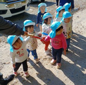 始めて園外へお散歩に行ってきました。冬の季節や寒さを感じながら,みんなでお散歩ロープを握り駐車場まで歩きました。ちょうちょやハトが飛んできたり,秋の葉っぱや草花を見たりしていると,自然とみんなで「ちょうちょ」の歌を口ずさみながら散歩をする姿が見られました。