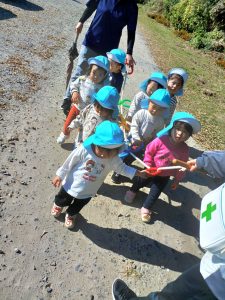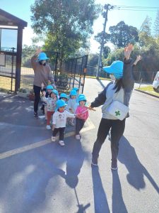 園外の散歩経験を通して,少しずつ活動の範囲も広がり,季節や自然を感じたり,友だちと一緒に草花や虫などにも気付いたりと新しい発見を楽しんでおり,また一つ成長を感じました。これからも子どもたちの「できた」を一つひとつ大切にしながら見守っていきたいと思います。