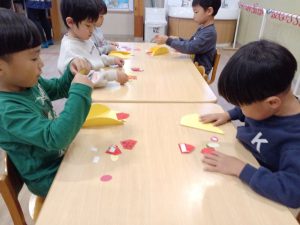「いらっしゃいませ」のかけ声を合図に,いよいよお店がオープン。商品を紹介したり会計をしたり,それぞれが任された役割を一生懸命に取り組んでいました。また,年下の子にやり方を説明したりお手本を示したり,年長児として成長した姿もたくさんみられました。