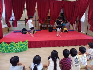 練習のなかでセリフに合わせた表情を考えたり,友だち同士でアイデアを出し合ったり,自分たちなりの工夫を見つける姿が沢山見られています。発表会までの日を数えていると,「もうすぐだね,緊張するけど楽しみ!」「かっこいいところを見て欲しいな」と話す姿がありました。当日はこれまでの練習の成果を元気いっぱい発揮し,みかん組らしい表現ができるように頑張ります。