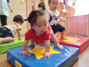 始めは,少しドキドキしていた子どもたちもお友だちの真似をしたり,保育者と一緒に取り組んでみたりすることで,少しずつ自分からマットの上に手を伸ばして段差を乗り越えようとする姿が見られました。