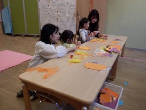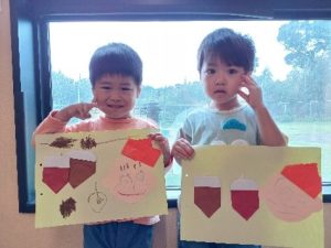 毎月,季節に応じた壁面製作に取り組んでいます。「今日は製作するよ。」と伝えると子ども達から「今日は何を作るの?」と楽しみにしながら嬉しそうな返事が返ってきます。今月は,秋をテーマに,どんぐりと帽子を折り紙で折り,似顔絵を描き背景にクレヨンで落ち葉を描きました。最初は「できない。」「難しい。」と苦戦する様子もありましたが,1工程ずつ丁寧に伝えながら取り組むと「できた!」と嬉しそうにしていました。また,分からない時は,保育教諭に聞くだけでなく,周りのお友達に聞き,教えてあげる優しい一面もありました。