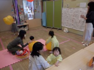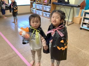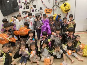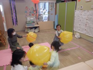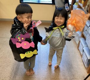 最後は,大きなポリ袋を,ジャックオーランタン(カボチャのおばけ)のボールに変身させて,部屋中を走り回りながら,親子でのキャッチボールを楽しんでいました。