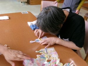 事前に作っておいた吹き流しや提灯(ちょうちん)や輪飾りなどを、多くの入所者様が「きれいね。」「長い吹き流しだね。床に着くよ。」などとお話をしながら笹に結んでいきました。