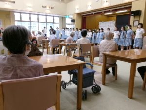 子供たちの心のこもった歌『童謡メドレー』『翼をください』や手紙のプレゼントに、入所者の皆さんから満面の笑みがこぼれていました。一緒に折り紙をしたり話をしたりして、あっという間の一時間でした。歓迎やお別れの言葉や事前に作ったしおりをお礼に贈りました。