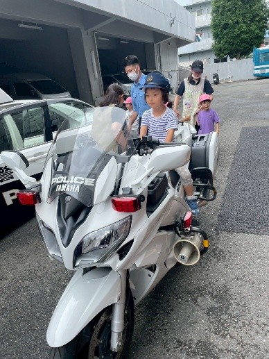 警察署を訪問し、実際にパトカーや白バイに乗せていただきました。本物のパトカーや白バイに目を輝かせ興味津々の子どもたちでした。