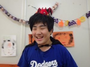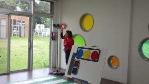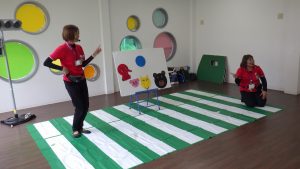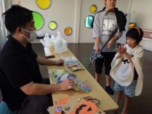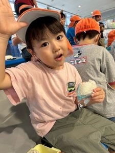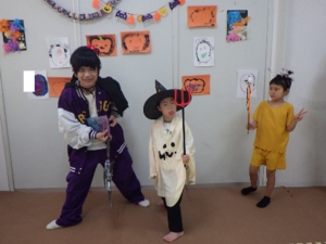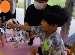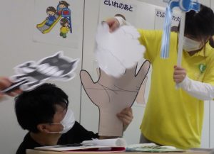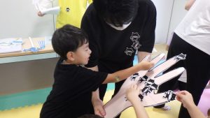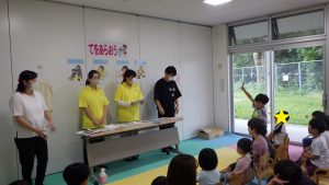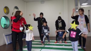 今回は運動あそびを通して、身体の使い方を確認したりスピードを調整したりすることをねらいに忍者ごっこを行いました。子どもたちに忍者について尋ねたところ「ゆっくり動く。」、「敵が来たら隠れる。」などイメージしたことを言葉で伝えてくれました。また、取り組み中にタンバリンの音が聞こえると、敵の合図と伝え、隠れたり動きを止めたりことを事前に約束しました。これらのことを意識し、最初に、身体に鈴をつけ、鈴が鳴らないような動きに取り組めるよう、ブロック上や平均台を渡る際、ゆっくりとした動作を促したり丁寧に動いたりと見本を提示することで模倣することができました。また、壁の手裏剣をゲットするため、背伸びを促すと、狙った手裏剣を取ろうと一生懸命な子どもたちです。取り組んでいる最中にタンバリンの音が鳴ると、隠れたりその場に止まったりとよく聞き分け素早く反応することができました。