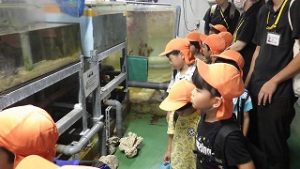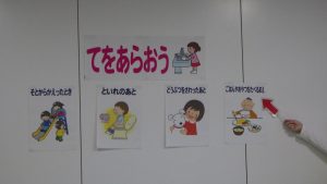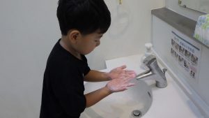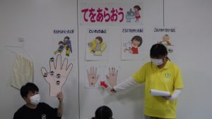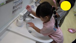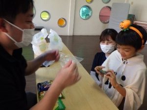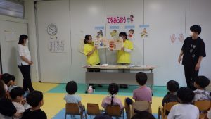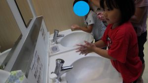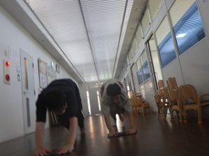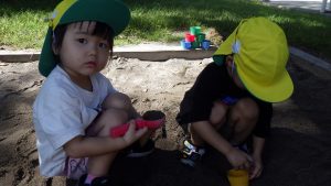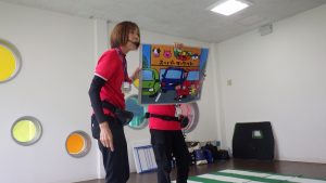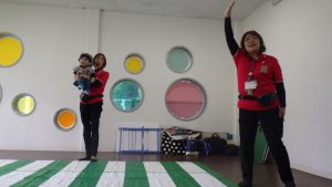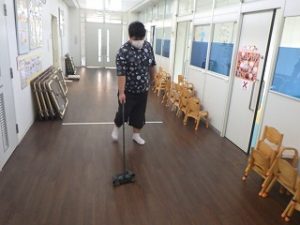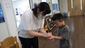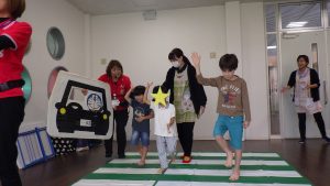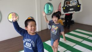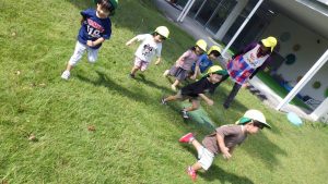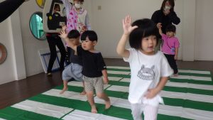 次に、手足や身体を小さく動かしながら潜ったり平均台を手足で掴み前進、後進したりする動きを取り入れました。前方も確認しながら、音も立てずに、敵を察知しながらと、意識することが多く、いつも以上に真剣な表情の子どもたちです。手足の位置や動かし方など、その都度確認し伝えることで、最後までたくさんの動きに挑戦することができました。今後も動きやスピードを意識した遊びや活動を提供し、静と動のメリハリにも繋げられるような支援を行っていきます。(竹之下)