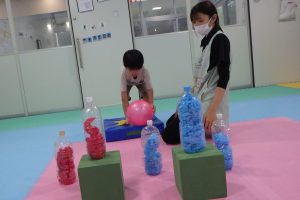 余暇時間の際、子どもたちに取り組みたい遊びを尋ね、言葉で伝えたり写真を指差したりしながら自分の気持ちを伝えることができるよう働き掛けています。いつも塗り絵、トランポリン、ブロック、バランスボールが大人気です。