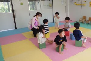 余暇時間の際、子どもたちに取り組みたい遊びを尋ね、言葉で伝えたり写真を指差したりしながら自分の気持ちを伝えることができるよう働き掛けています。いつも塗り絵、トランポリン、ブロック、バランスボールが大人気です。