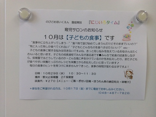 10月29日(水)に、地域の方向けの育児サロン『子どもの食事』を行いました。当日は2組の親子が参加してくださり、お互いに“はじめまして!”ではありましたが、和やかな雰囲気の中、体づくりの要となる食事についてお話をしました。お子さんの年齢によって悩みはそれぞれ。家庭での悩み事をお話しながら、園での対応や食事支援について栄養士からお話をさせていただきました。実際の給食を試食しながら、お母さんが給食の味付けや硬さを確認したり、お子さんがおいしそうに食べて催促している姿を見て「あっ!これ食べられるんだ!お家でも作ろう♪」と発見があったり、実際同年代の園児が食事をしている姿を見て、ヒントや気づきのある貴重な時間となりました☻
