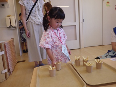 10月29日(水)に、地域の方向けの育児サロン『子どもの食事』を行いました。当日は2組の親子が参加してくださり、お互いに“はじめまして!”ではありましたが、和やかな雰囲気の中、体づくりの要となる食事についてお話をしました。お子さんの年齢によって悩みはそれぞれ。家庭での悩み事をお話しながら、園での対応や食事支援について栄養士からお話をさせていただきました。実際の給食を試食しながら、お母さんが給食の味付けや硬さを確認したり、お子さんがおいしそうに食べて催促している姿を見て「あっ!これ食べられるんだ!お家でも作ろう♪」と発見があったり、実際同年代の園児が食事をしている姿を見て、ヒントや気づきのある貴重な時間となりました☻