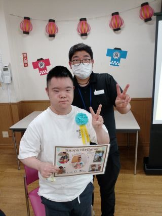 また、8月生まれのご利用者様の誕生日会も行いました。参加者全員でバースデーソングを歌い、職員手作りの写真パネルをプレゼントしました。今年も素敵な一年になりますように。(川添)